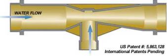 Image of an injector: Water flows from left to right; ozone is introduced into the middle
