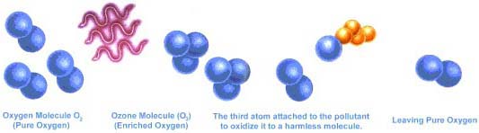 See image below for how ozone destroys odors by oxidation. Ozone reacts with a foreign odor to change is composition so it is no longer the same odor. A new molecule is formed but this new molecule is typically less odorous that the original one.